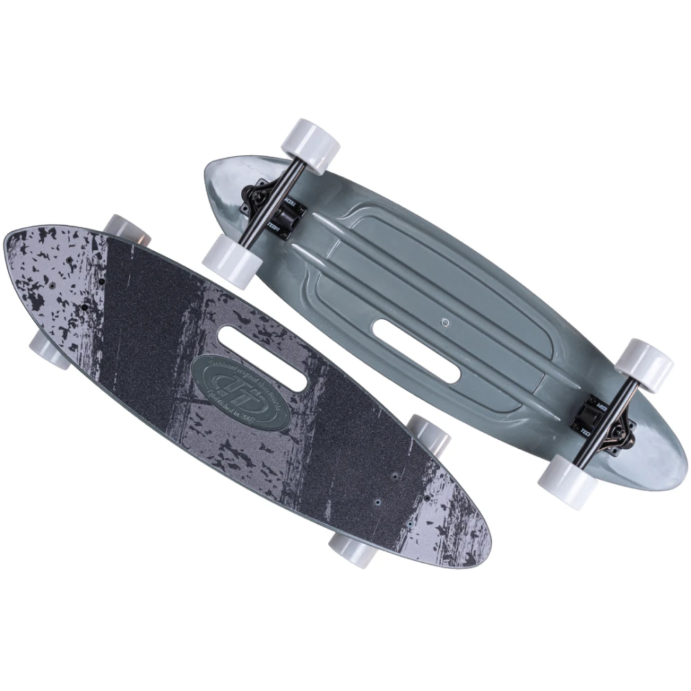 Лонгборд  пластиковый Fishboard 31 черный TLS-409. Модель выполнена в виде рыбки, острые углы с обоих краёв позволяют без труда начать движение на даном варианте  скейта. Fishboard 31 черный TLS-409 не зациклен на мужской либо женский, он подходит абсолютно всем.  Верхняя часть деки покрыта шкурой, которая обеспечивает хорошую сцепку с ногой. Дека выполнена из высококачественного полипропилена, что позволяет ей выдержать высокий вес. Колёса 64*47 мм позволяют скейтборду двигаться плавно и придают отличный накат, а скорость - знаменитые подшипники ABEC 7. Для удобства переноса в деке сделана гармоничная вырезка в центре. Такой вид скейтбордов делает популярным неприхотливый материал изготовления, так как пластик не изнашивается продолжительное время и не теряет своих свойств. Стиль и практичность, а также качество изготовления дарят множество положительных эмоций, уверенность и безопасность от компании Tech Team.