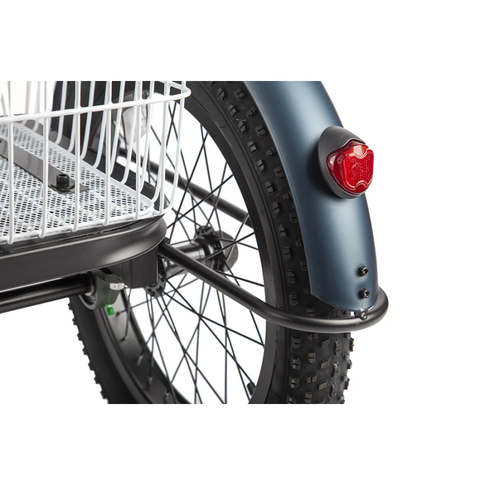 ТРИЦИКЛ ELTRECO PORTER FAT 700 работает от выносливой аккумуляторной батареи. На одном заряде можно проехать до 70 км. Имеет стильные светодиодные фары, стальные полноразмерные крылья. Впереди на руле расположена легкая корзина, сзади – большая вместительная.
