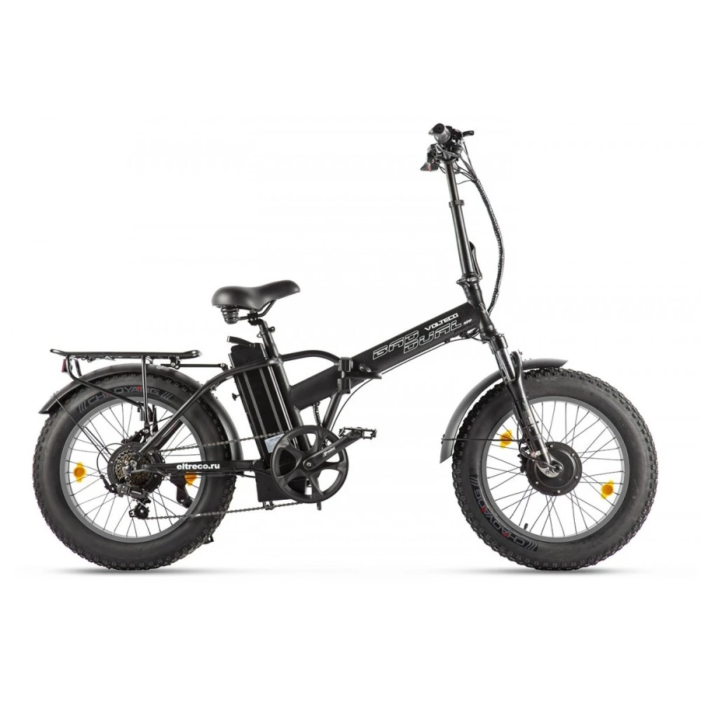 Модель электровелосипеда  VOLTECO BAD DUAL NEW самая компактная на всем потребительском рынке, черного цвета, с низкой посадкой. С первого взгляда похож на детский, но по всем своим характеристикам достаточно мощный и способный перевозить большой вес до 140 кг. Подходит для езды по городу, возвышенностям, для дачи, отдыха, для  любителей быстрой и экстремальной езды, так как оснащен полным приводом.